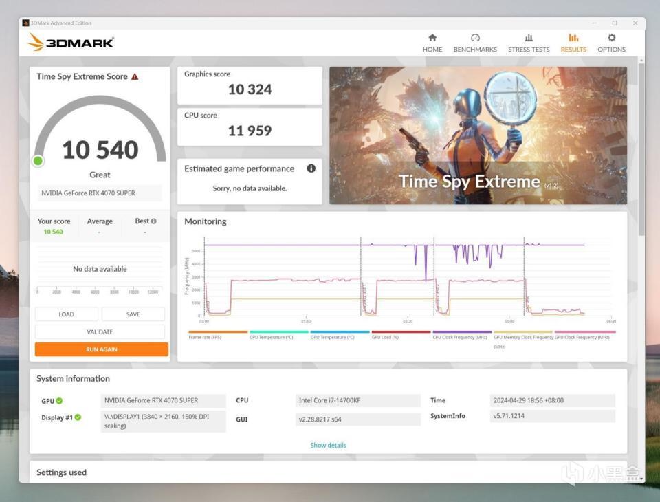TIME SPY EXTREME测试,得分10540,其中图形得分10324,CPU得分11959。