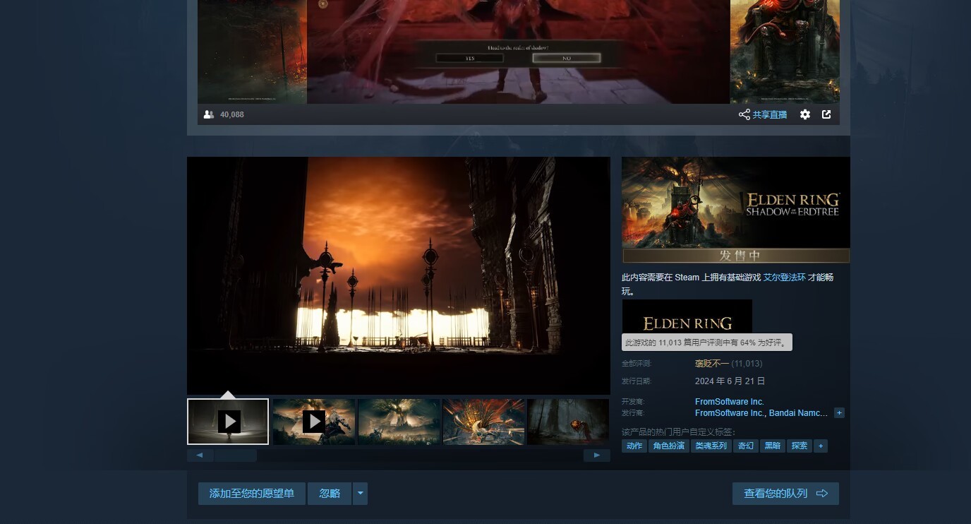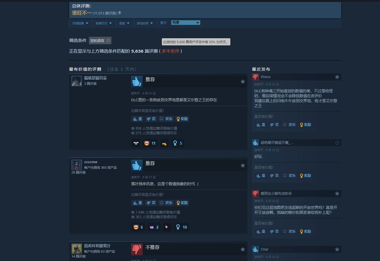 截至發文時間,《黃金樹幽影》在steam的好評率褒貶不一,11013篇評測中好評只有64%。中文相比全球其他語種,好評率就更低了,多半差評。目前中文有5636篇評測,好評率僅爲33%。