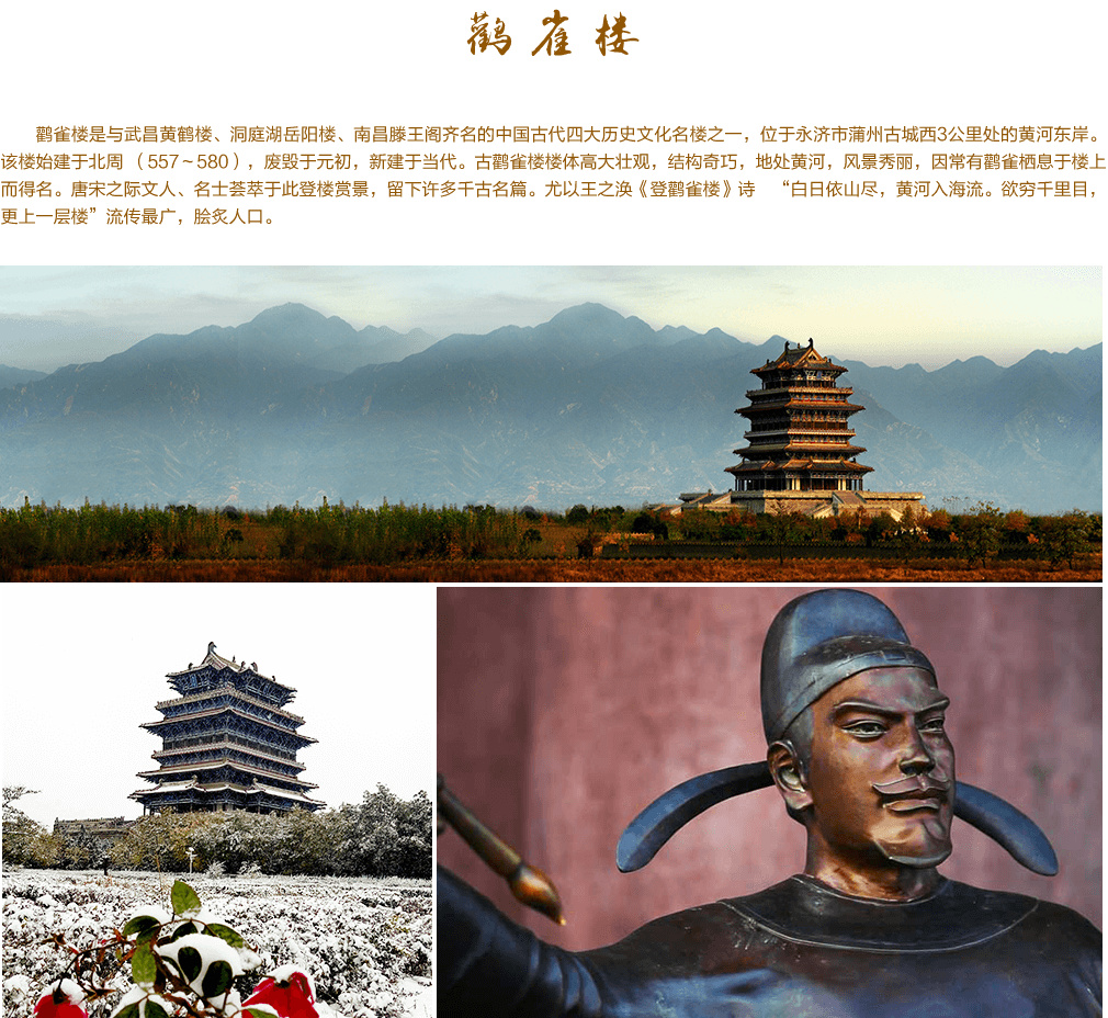 鹳雀楼为高台式十字歇山顶楼阁,是四大名楼中最高的一座,是中国仿造楼中较为精致的.鹳雀楼是国内唯一采用唐代彩画艺术恢复的唐代建筑.