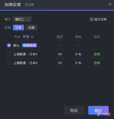 小黑盒加速器支持加速亞馬遜,有日本/北美節點供選擇。