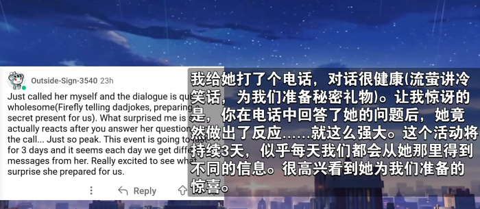 除了劇情和裏面的各種彩蛋,連遊戲外的活動也在瘋狂發糖,在“超距通信”活動中,玩家可以連續三天與流螢打電話,每天的內容都不一樣。在通話中玩家彷彿與流螢一起置身在夏夜,聽着知了的叫聲,數着天上的星星。最用心的一點是,通話並不是單純的錄音,還有互動環節,回答對了流螢的問題能得到她的“獎勵”,這待遇把國外的玩家都酸瘋了,憑什麼只有國內玩家能和流螢通話啊,我們也要!