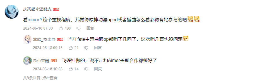 而像這樣的頂級歌姬,居然會在自己的演唱會上安利和演唱原神曲目,說明Aimer對原神也確實是相當重視了。那Aimer的這種表現,也讓不少原神玩家開始暢想,等原神動畫上線後,或許她可以爲其演唱幾首OP、ED以及插曲。總之,原神動畫裏可以有Aimer的聲音