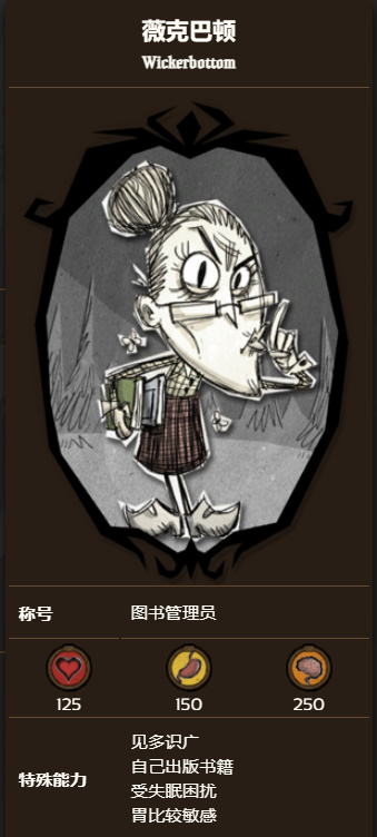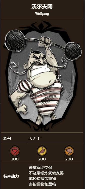 * 沃爾夫岡具有十分明顯的優點和缺點:如果力量值很高,沃爾夫岡就能造成高額傷害,而且能快速搬運重物,工作效率也會得到提升;如果力量值較低,沃爾夫岡的攻擊力和工作效率也會降低。力量值隨時間自然掉落,但他可以通過使用啞鈴和強大健身房鍛鍊來提升力量值,並且可以通過大多數工作和攻擊來提升力量值。此外,受黑暗和怪物的影響,理智值降低速度更快,沃爾夫岡的隨從則能部分抵消這一缺陷。對於經驗不足的玩家,可以多嘗試,死的次數多了會玩了,就能體會到他的強度了,裝備好,喫點加攻擊力的食物,鍛鍊一下,打強力boss,一會就把他秒了,龍蠅什麼的直接就是小趴菜。