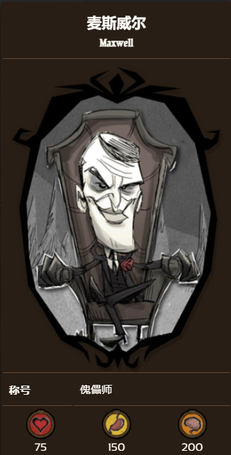 * 他曾是夢魘王座的主人,永恆領域的前任統治者。他是夢魘王座上的前國王,也是個自大狂。麥斯威爾(他的名字來自於他以前的舞臺角色“神奇的麥斯威爾”)曾經是天真爛漫的“威廉·卡特”。這個來自倫敦的身無分文的人,夢想着成爲世界知名的魔術師。當命運讓威廉拿到暗影祕典的時候,他有生以來第一次感受到了真正的力量。於是他拋棄了以前的溫順,完全接受了他的新身份,成爲了一個充滿魅力的黑魔法大師。儘管已經功成名就,但是他仍然發現自己渴望得到更多。他在魔法書中越鑽越深,沉浸於其中的祕密。黑暗的知識使他的思想和心靈蒙上了一層陰影。在他最後的演出中,麥斯威爾長期肆無忌憚使用的暗影魔法終於失控了,他和他的舞臺助手查理都被拉進了永恆領域。他似乎將永遠待在那裏,被束縛在夢魘王座上,被迫將更多的受害者囚禁在永恆領域的陷阱中。