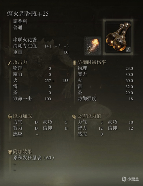 跟拒绝的刺并列的最强轮椅,普通玩家当然还是选择癫火调香瓶+串联火花香