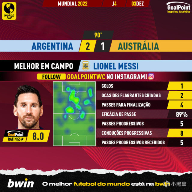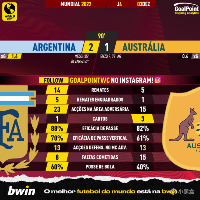 世界杯淘汰赛,阿根廷大战澳大利亚!上半场第34分钟,麦卡利斯特禁区外的直塞,奥塔门迪禁区内做墙,梅西在禁区内推射远角得手,阿根廷 1-0 澳大利亚!第57分钟,德保罗前场压迫下,澳大利亚队门将接回传球时出现超级超级巨大的失误,阿尔瓦雷斯禁区一脚巧射,阿根廷队 2-0 澳大利亚!第76分钟,古德温远射,经过恩佐折射打入一粒乌龙球!最终阿根廷 2-1 成功晋级八强,下一场将面对荷兰!