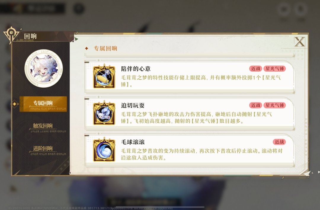 比如「毛茸茸之夢」的第三段普攻會滾動攻擊敵人,有一個專屬迴響,會讓他的普攻模組變成按一下就持續滾動,就很有趣。