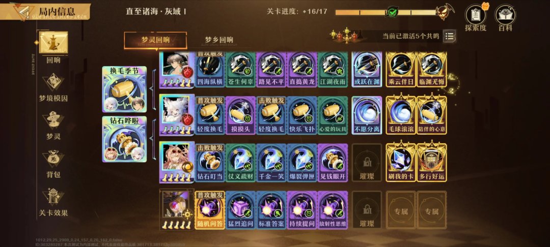 第二,在第一點的基礎上,《無盡夢迴》把各個層次的構築機制做得都很紮實,除了能獲取其他角色能力的觸發迴響、提升屬性的進階迴響之外,每個角色還有幾項專屬迴響,能不同程度地改變特性,甚至改變你的操作方式。