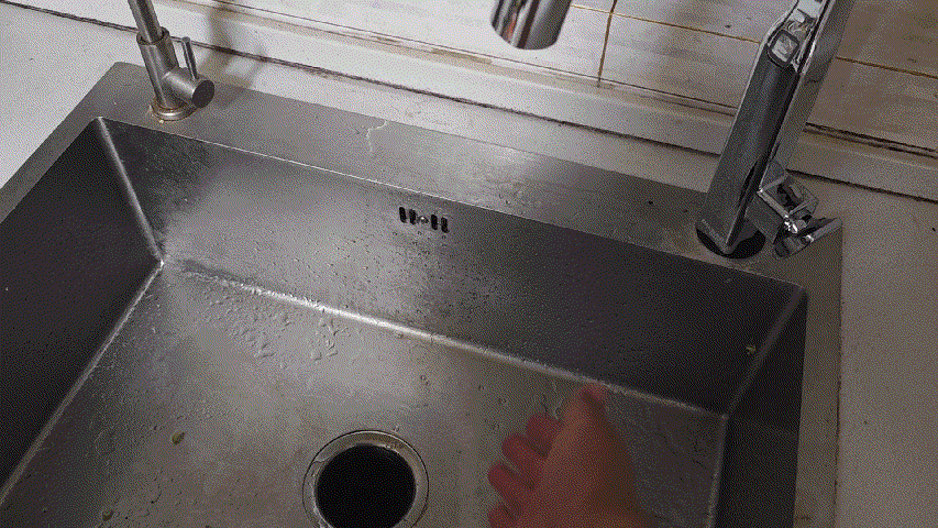 ▼水龍頭兩側傳感器同時觸發,會自動出水,同時啓動廚餘垃圾處理器。水龍頭上的指示燈會亮綠色。