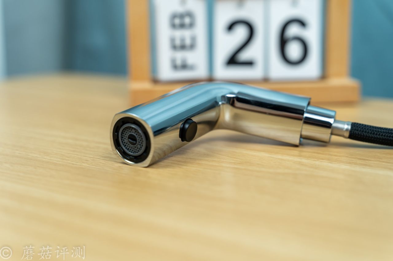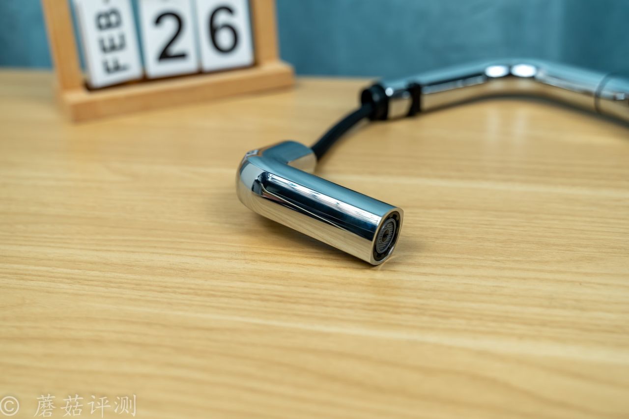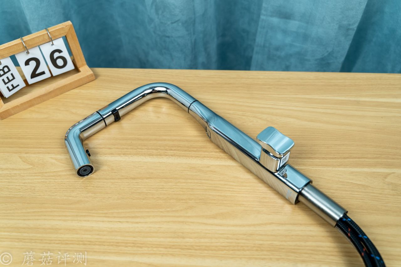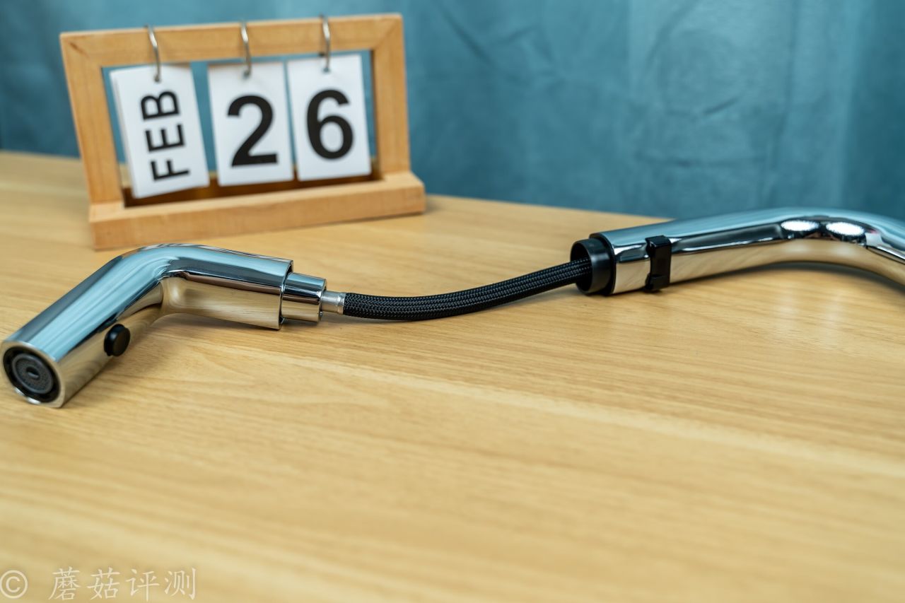 ▼水龍頭的前部支持抽拉,支持抽拉自動出水,日常使用超級方便。抽拉部分的水管非常柔軟,外面有編織網包裹,耐用又順滑。