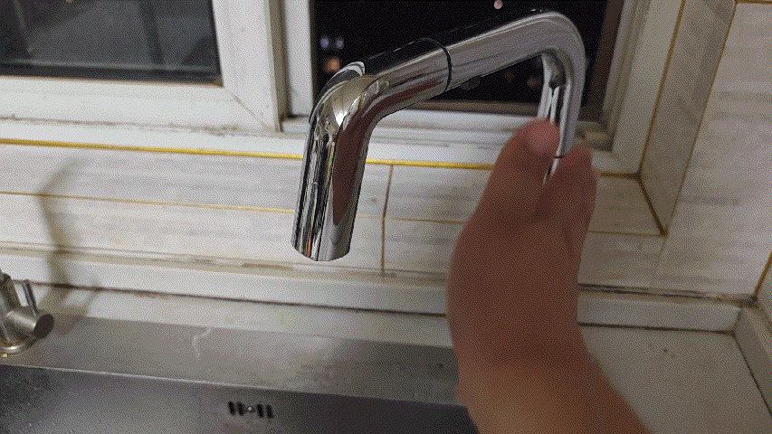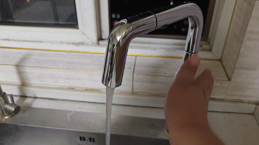 ▼除了點動之外,水龍頭的抽拉部分也支持自動出水,拉出就會自動出水,日常使用非常方便,放回就可以自動關水。