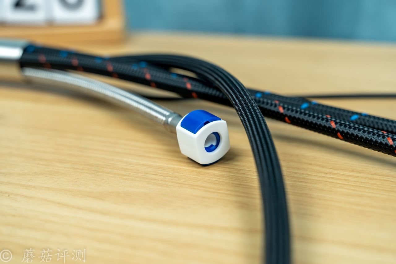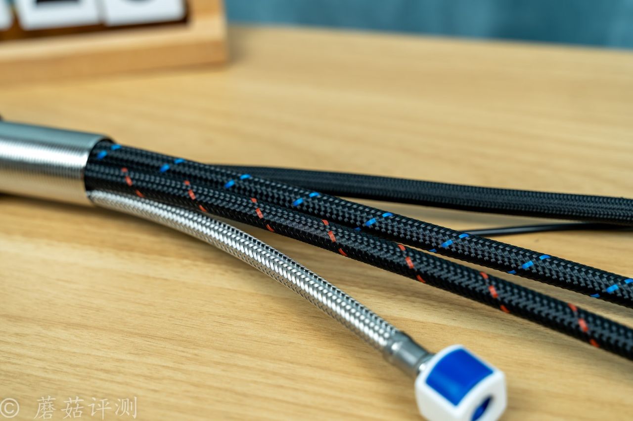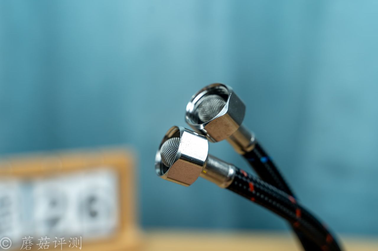 ▼水龍頭的冷水、熱水進水水管,外面有密集的編織網包裹,中間還點綴了紅色、藍色的點綴,紅色代表熱水、藍色代表冷水。