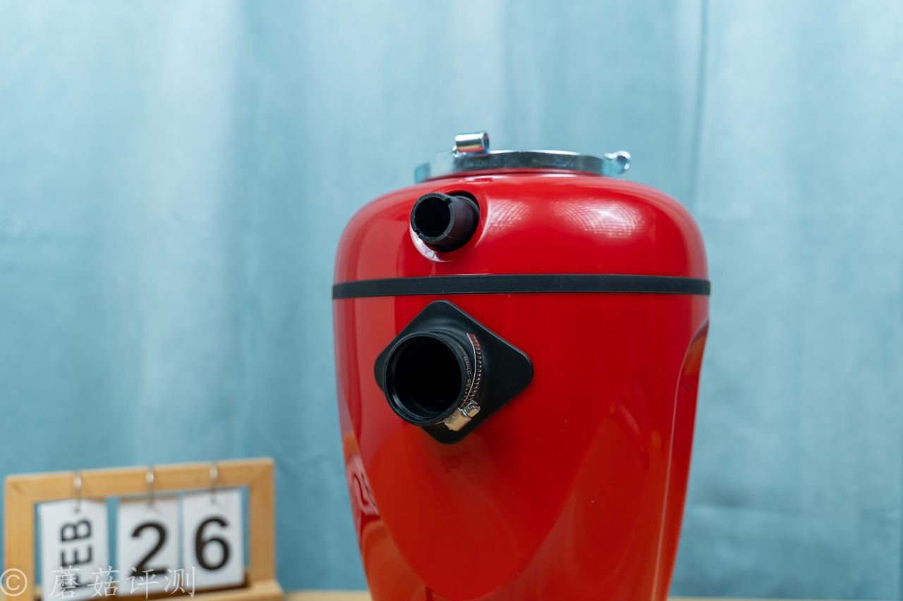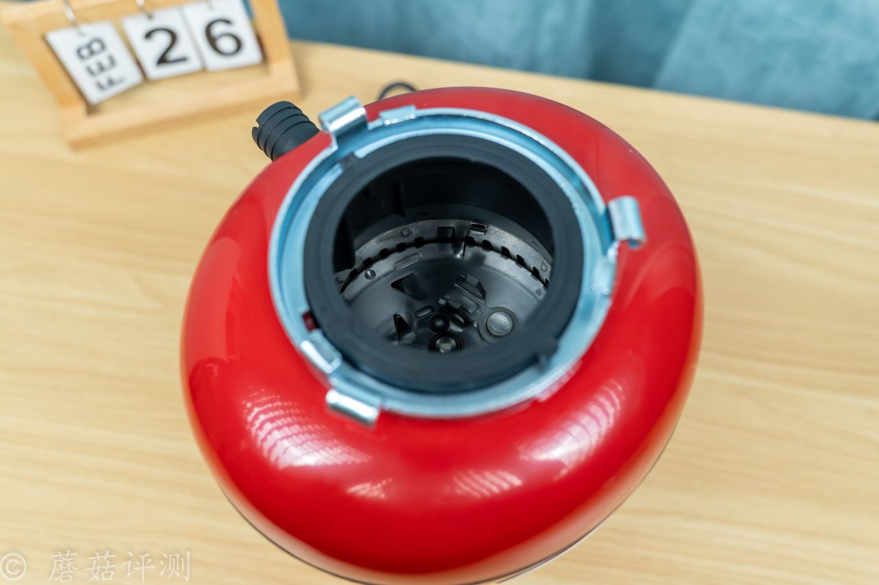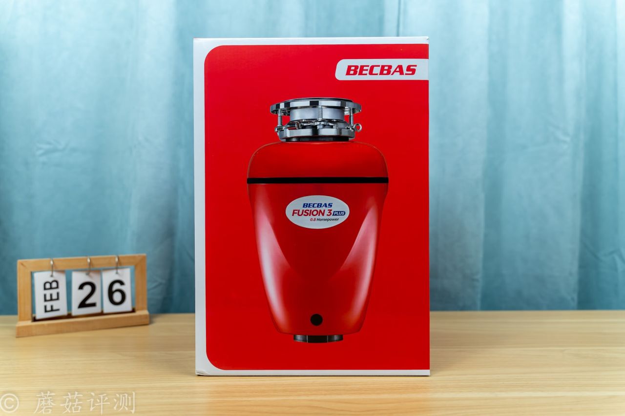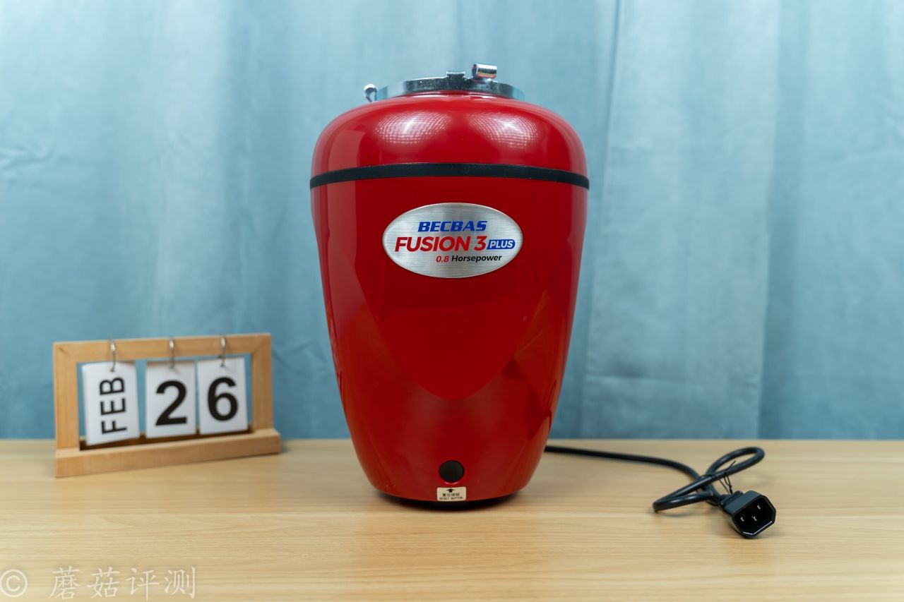 ▼貝克巴斯這款F3 PLUS廚餘垃圾處理器的外殼也是紅色的,正面有一個銀色的標籤,上面有型號、品牌之類的。