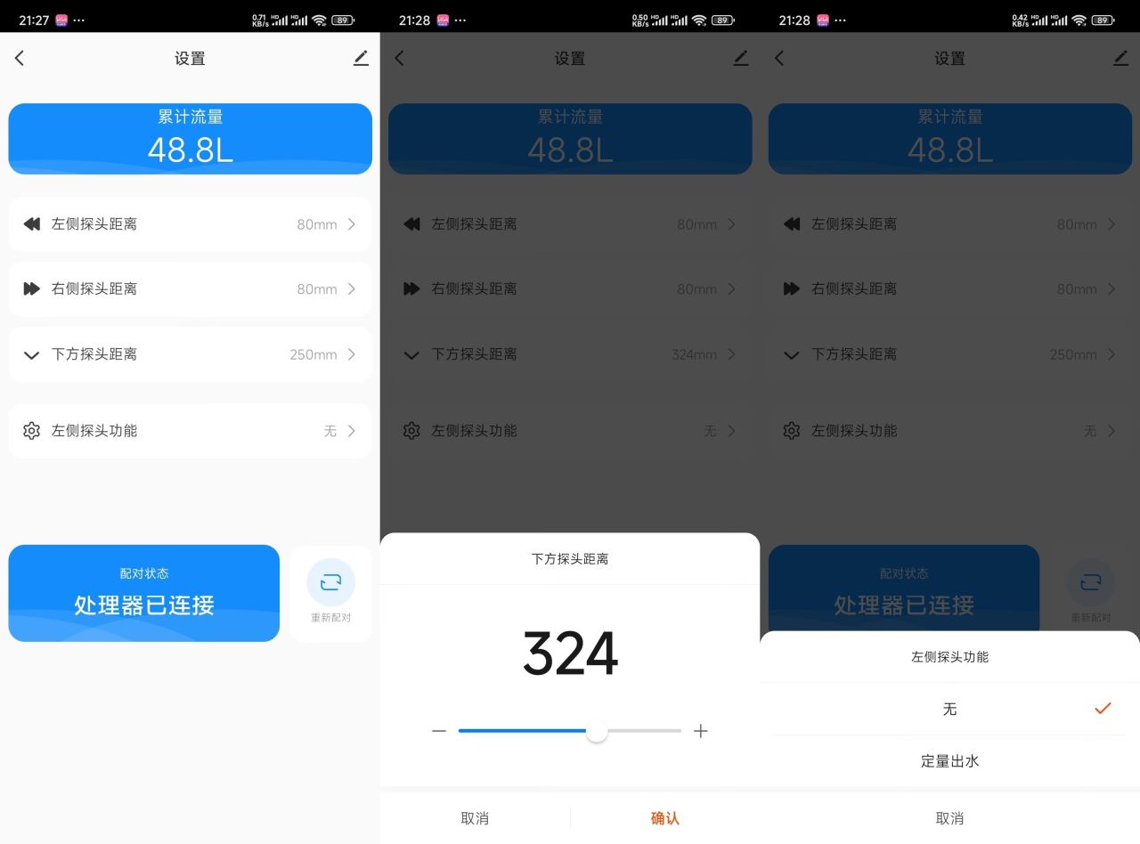 ▼軟件內還可以設置各種傳感器參數,包括左側、右側、下方的探頭距離,可以根據個人的使用習慣設置。最上面還有水量統計,可以統計出水總量。當然了,這些傳感器的數據設置,也可以在龍頭上操作,只不過操作要複雜一些。