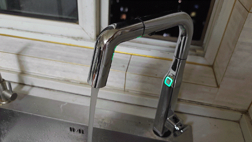 ▼水龍頭支持點動出水,手放在水龍頭下面就能出水,離開水就停,日常簡單洗個手、衝個菜都特別方便。點動出水的時候,水龍頭正面指示燈亮紫色燈,提示水龍頭的工作狀態。