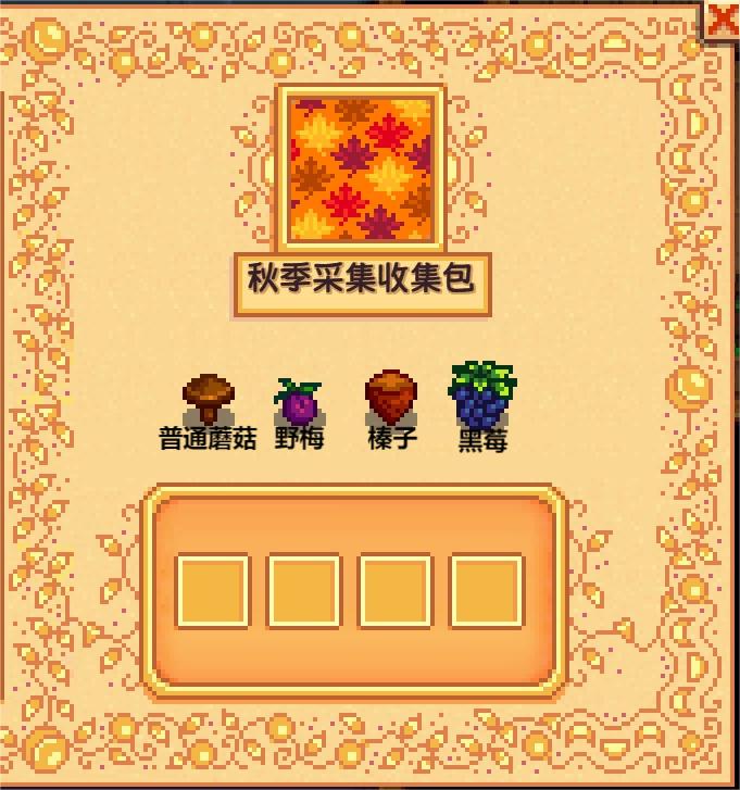 楓糖漿:1.把樹液採集器掛在楓樹上獲得,2.豬車購買(有概率碰到)