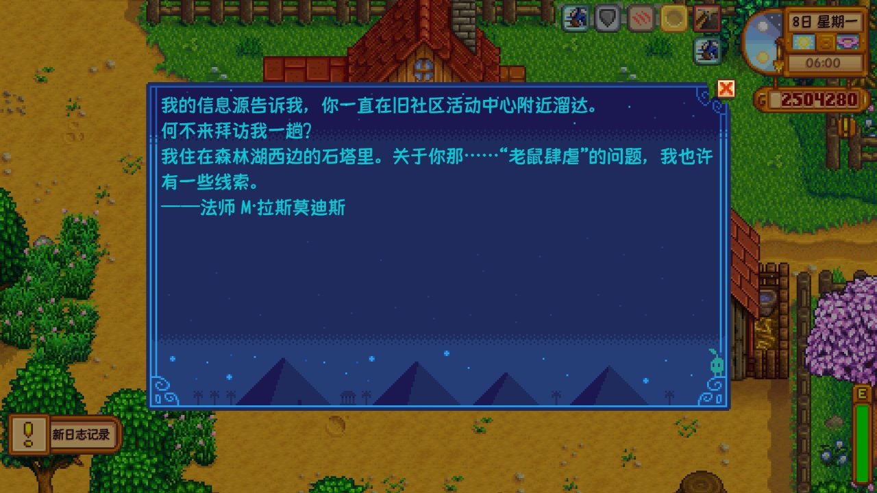 社區中心獻祭其實也就是社區中心修復,在我們剛來到星露谷時,社區中心是十分破爛的,我們則需要去修復它,從首年春季的第五日開始,我們在任何一個晴天的早上8.—下午1.之間,從巴士站區域前往小鎮區域即可觸發動畫劇情,這個動畫劇情中鎮長劉易斯會告訴我們關於社區中心的一些信息,我們還會看到一種叫祝尼魔的生物,動畫劇情結束後,將會出現第一個解鎖任務“老鼠肆虐”