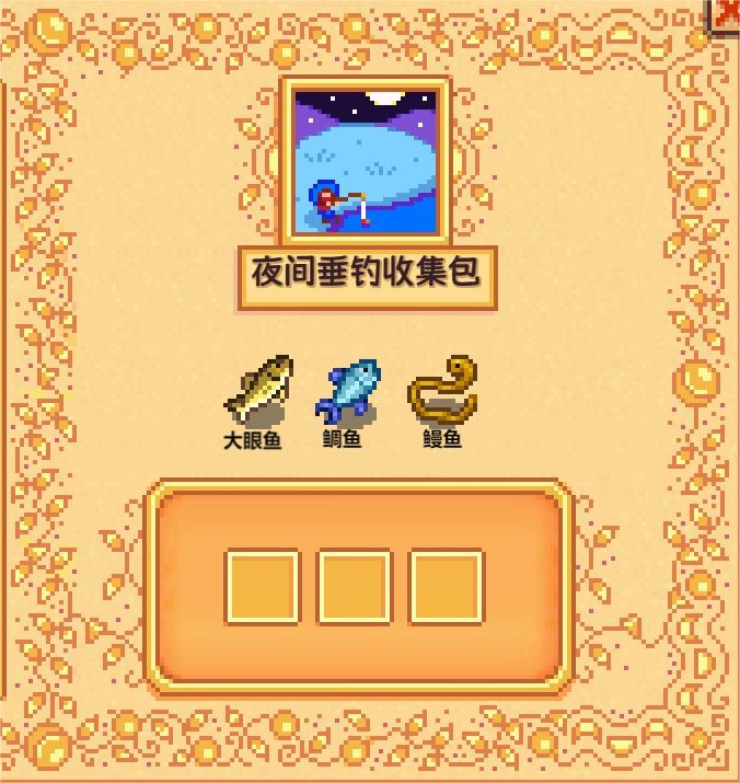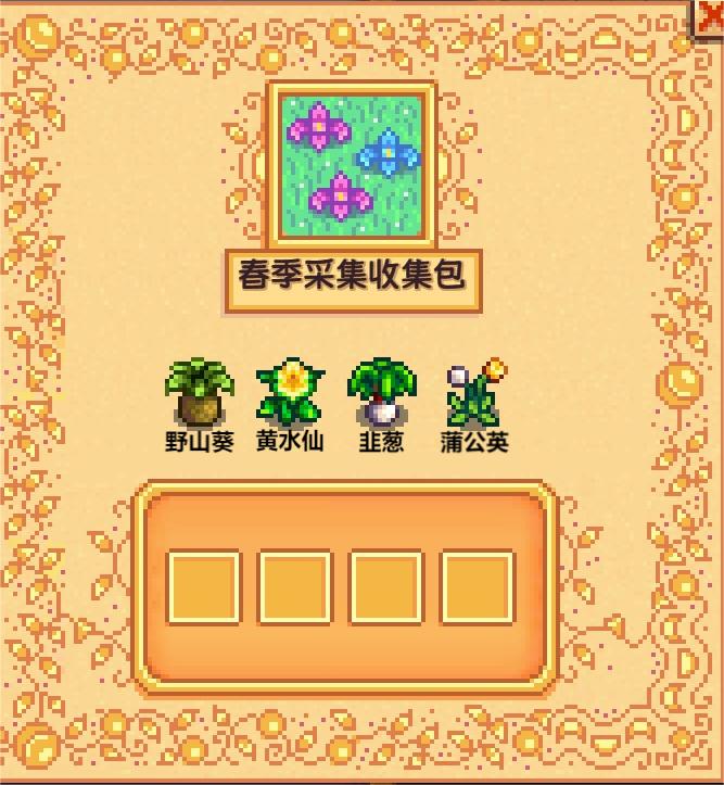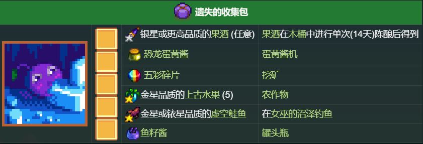我們進去後即可看到廢棄joja超市的獻祭板塊,裏面只有一個收集包,是“失蹤的收集包”,這個收集包是我們獻祭流程中的最後一個收集包