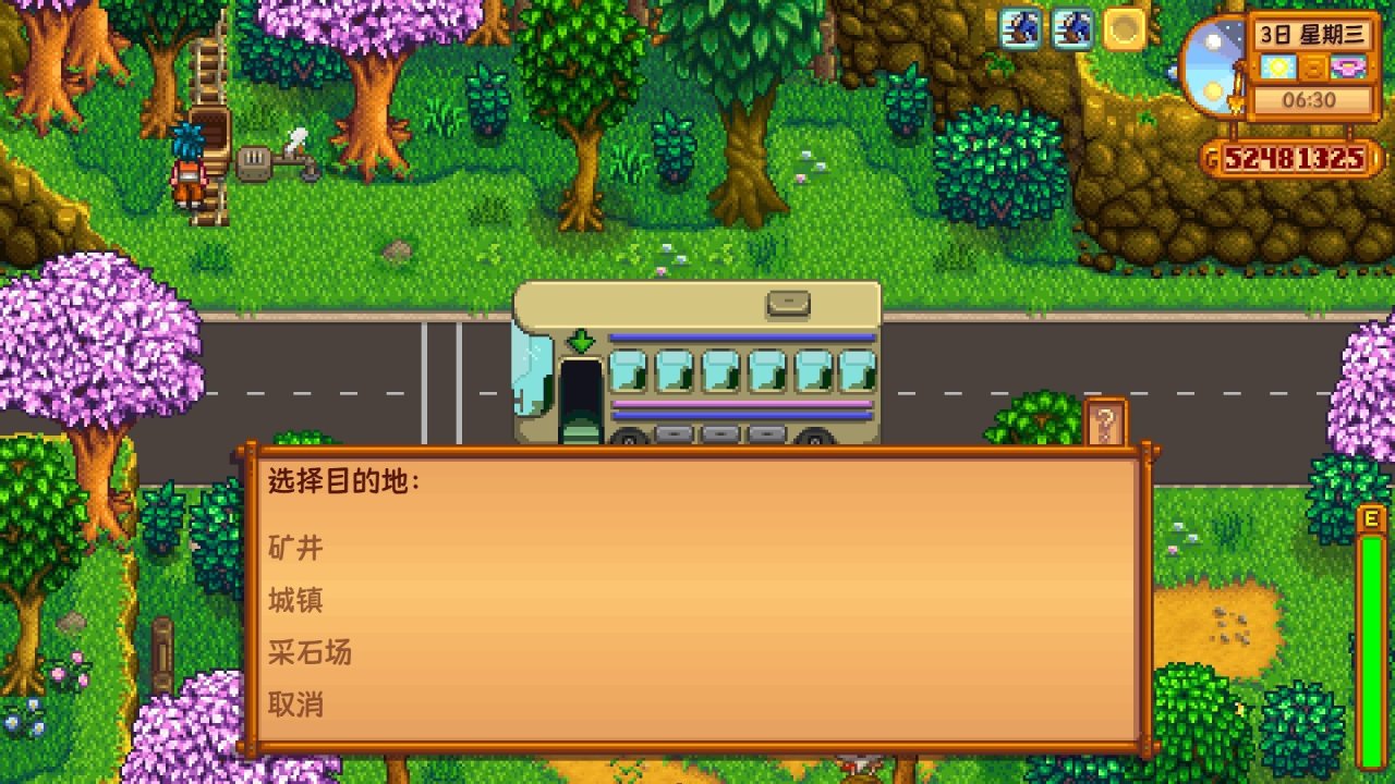 金庫會被修復,在這天晚上睡覺時公交車也會被修好,第二天開始潘姆就會來這裏當司機,潘姆的上班時間爲早上10.—下午5.(我們可以在早上8.30的時候到她家門口堵一下她,等她頭上冒出氣泡並穿過我們的時候,她的行走速度就會快很多,可以在早上9.30的時候就到公交車這裏),在潘姆上班期間你可以通過買票前往沙漠,每張票的價錢是500金,潘姆不在公交車旁你是買不了票的,有時候她不上班就會留下個文字標牌,這時我們玩家就可以自己買票去,想什麼時候去都行,只限當天