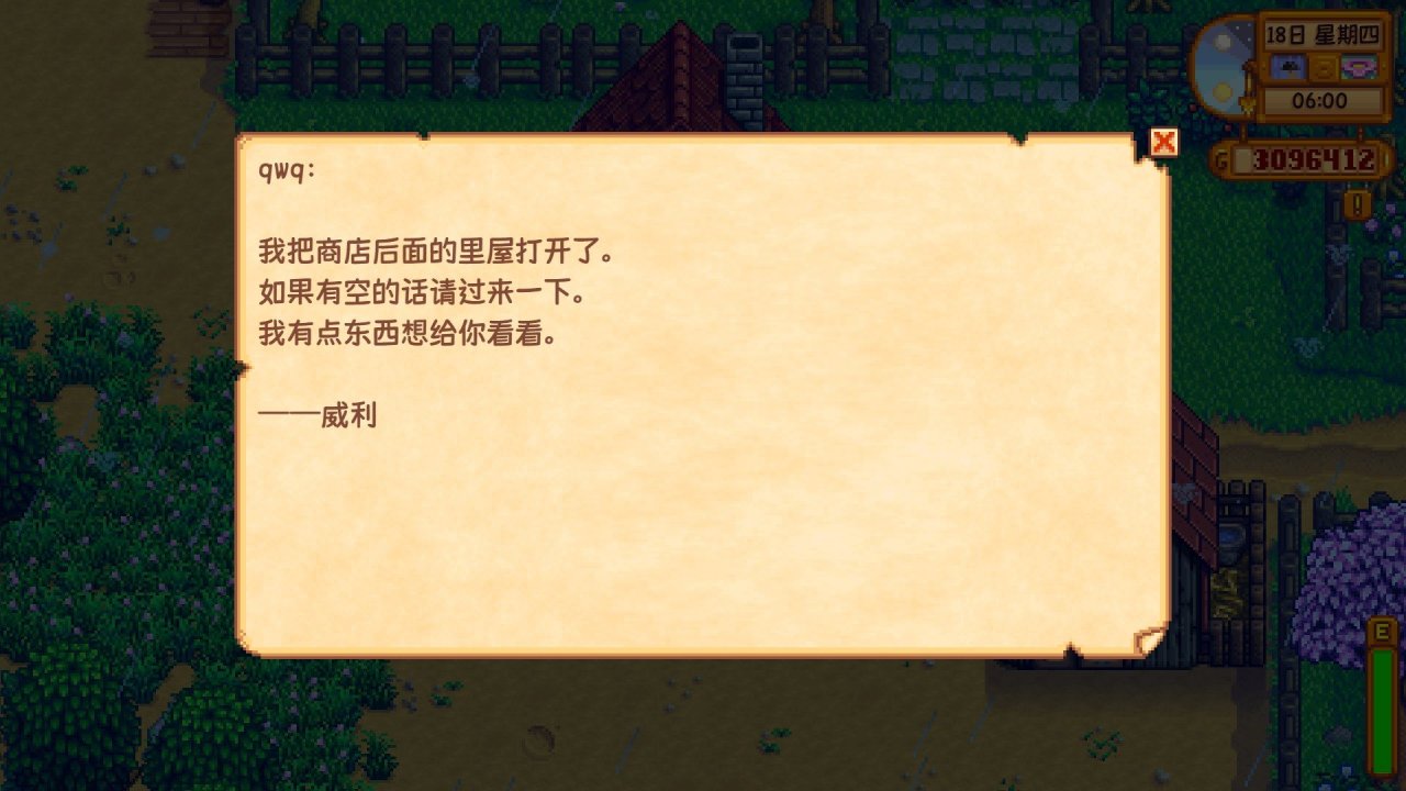 3.完成社區中心修復後,第二天如果是晴天的話,威利會寄給你一封信,讓你去他的後屋看看,這個記得一定要去,是開啓姜島的任務