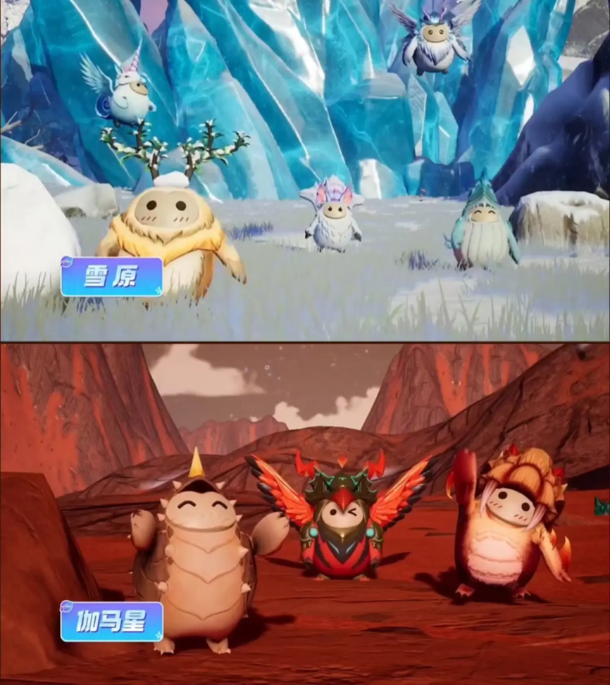 高聳入雲的黑塔信標、茂密的森林、滾燙的沙漠,還有溪流、雪原等等的不同地形,玩家將在探索當中看到不同星球生態下的啾啾,例如在沙漠礦坑當中生活的霸王晶龍啾,以霸王龍爲原型,渾身充滿鱗甲殼皮膚,巨大白骨裝飾和晶體背鰭,都和沙漠地形生態相關。