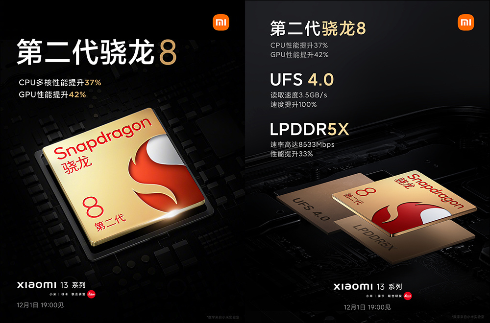 硬件规格方面, Xiaomi 13 与 Xiaomi 13 Pro 皆搭载高通 Snapdragon 8 Gen 2 旗舰处理器, CPU 多和性能提升 37%、GPU 性能提升 42% ,其中 Xiaomi 13 Pro 预计最高配备 12GB LPDDR5X RAM 与 512GB UFS 4.0ROM,最新的 LPDDR5X RAM 性能提升 33%、 UFS 4.0 速度提升 100%,传闻将提供 8GB+128GB、8GB+256GB、12GB+256GB 与 12GB+512GB 四种组合。另外在 Xiaomi 13 则采用 UFS3.0 保存规格。