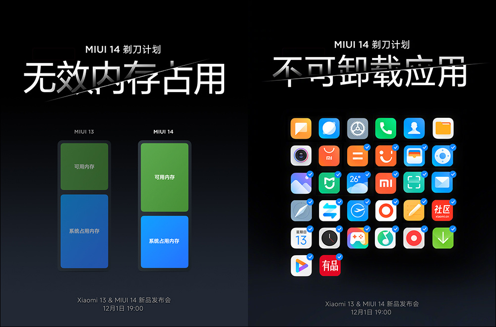 MIUI 14 占用的保存空间更小、不可移除安装的应用程序也比过去更少,让用户可有更多的使用空间。