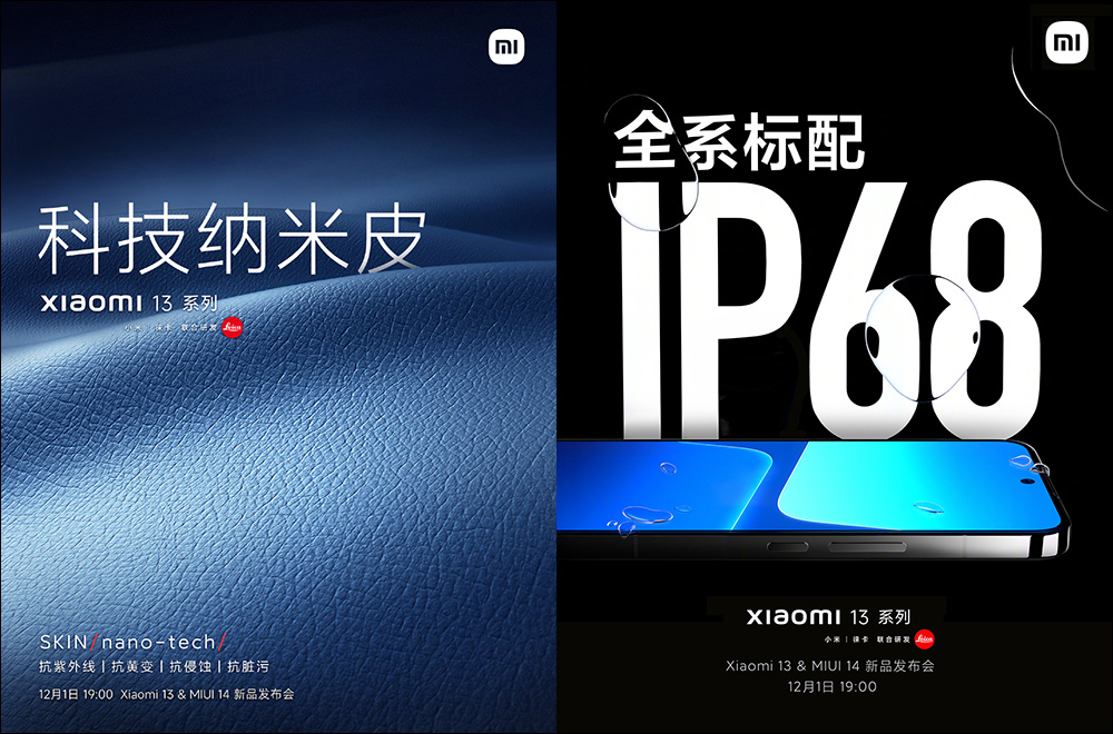 Xiaomi 13 系列除了玻璃机身,另有提供科技纳米素皮材质版本,这款素皮材质拥有更好的抗磨损、抗变色与抗脏污能力。同时 Xiaomi 13 与 Xiaomi 13 Pro 皆具备 IP68 防水等级。