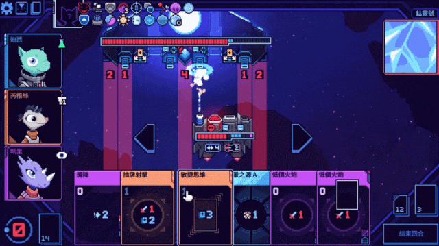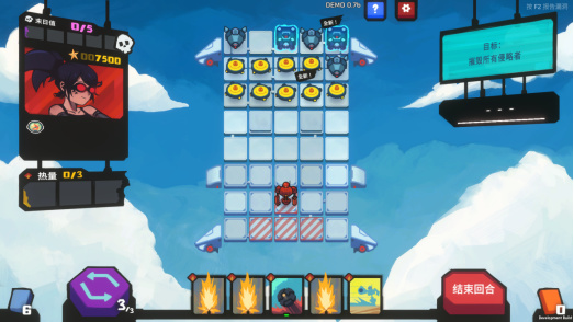 而與傳統的卡牌遊戲不同,當玩家操控的機甲遭到攻擊後並不會直接損失血量,而是在牌組中加入一張“垃圾”牌來污染卡組,真正與玩家生命值掛鉤的是左上角的末日值,這個只有當敵人進入棋盤最下面三行沒有被及時消滅時纔會累計。特別要說的是,雖然卡牌都是按費用出,但是這遊戲裏是允許玩家超載一費的,雖然這樣做會導致超費使用的那張牌在本局中無法再繼續使用了,但是通過一些卡牌和道具的效果,我已經能預測將來會有一套針對這種打法而組成的build。