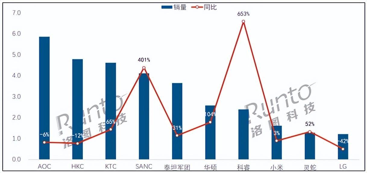 同時從品牌出貨量的統計來看,根據洛圖科技最新的報告,在2024年5月中國大陸電競顯示器線上市場,AOC銷售的近6萬臺產品中,1199元的Q27G2S/D銷量貢獻較大,在該品牌內部佔比達36%。KTC也是得益於平時售價才700多元的H27T22C在市場的良好表現,銷量同比增長65%,出貨量和HKC已經非常接近。同時SANC、科睿、靈蛇等新興品牌動輒同比401%、653%的同比提升,也擠入出貨量榜單的前十,其攻城略地的利器之一就是低價的2K電競顯示器。