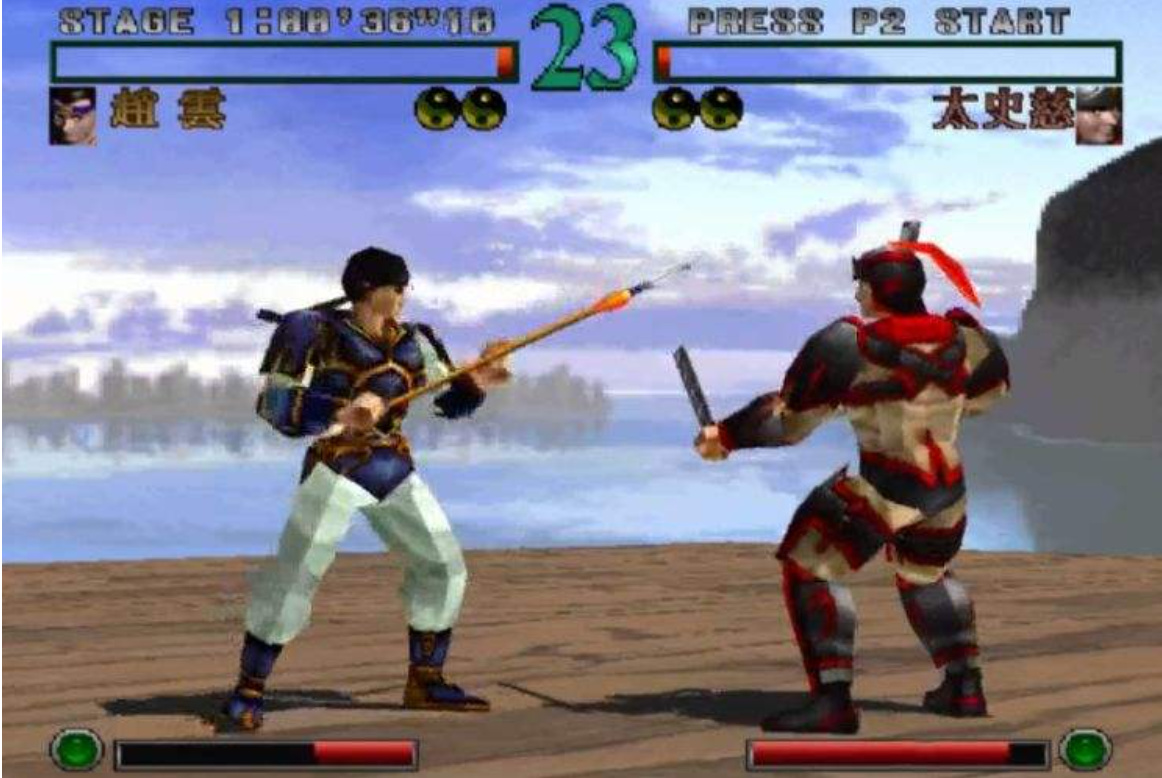 沒錯,如上圖所示,這特喵的是個格鬥遊戲,當然有一些後續應用在系列中的系統比如“無雙”,也就是爆氣條(角色下方的紅條)已經初顯雛形——那麼,趙雲毫無疑問又是必定會出場的代表性角色了。