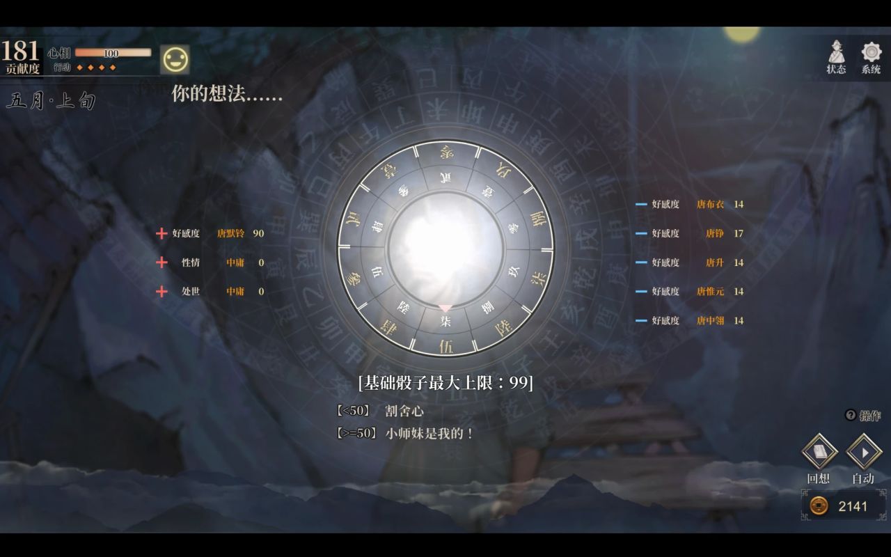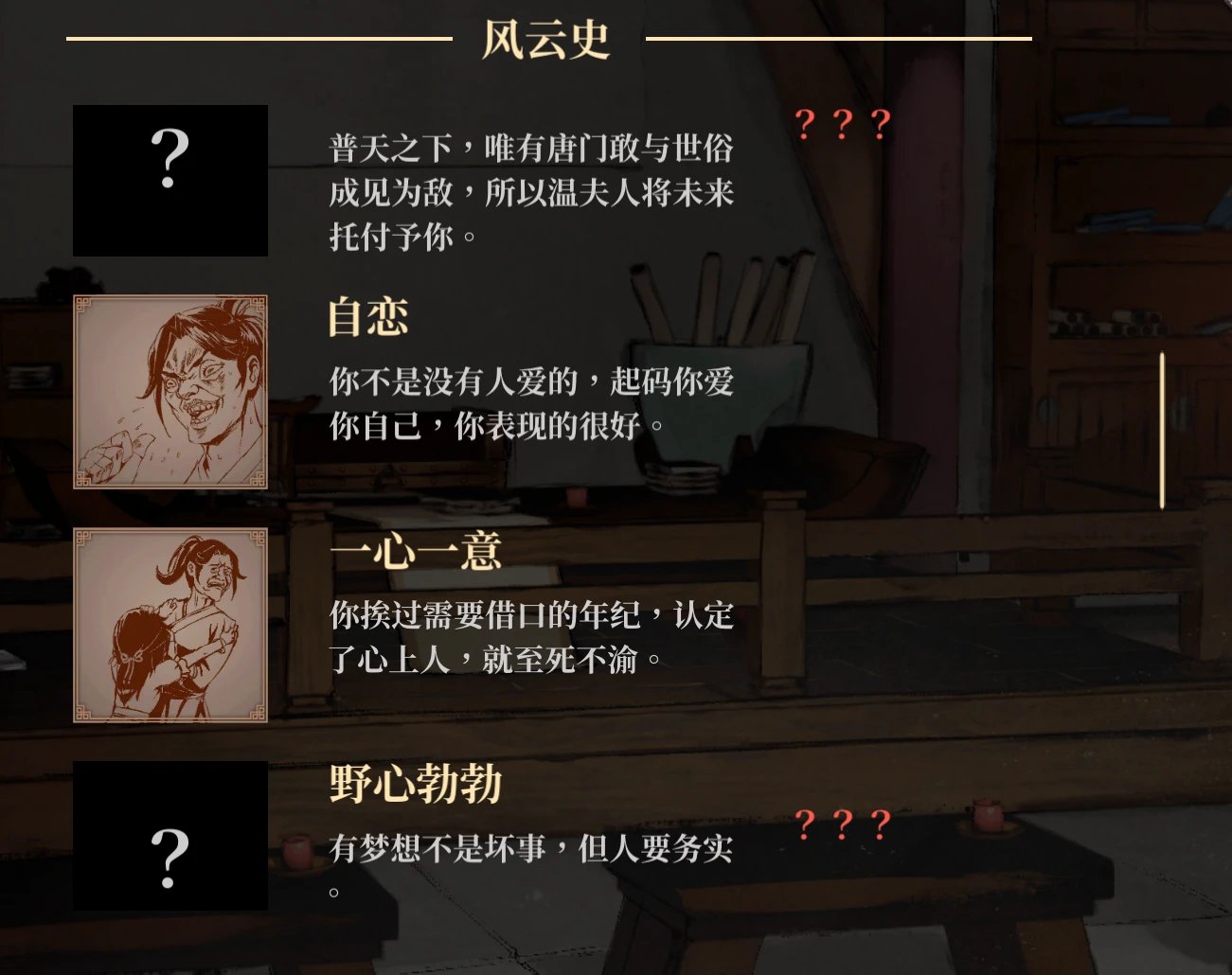 如果后续的Roll点给我的感觉是“天命难违”(比如我和各派关系不好,就怎么也Roll不出唐门压倒性胜利),那前期的这些Roll点,给我的感觉就是为了让玩家搜集一些Badend,但从剧情流程上并没有设计好。
