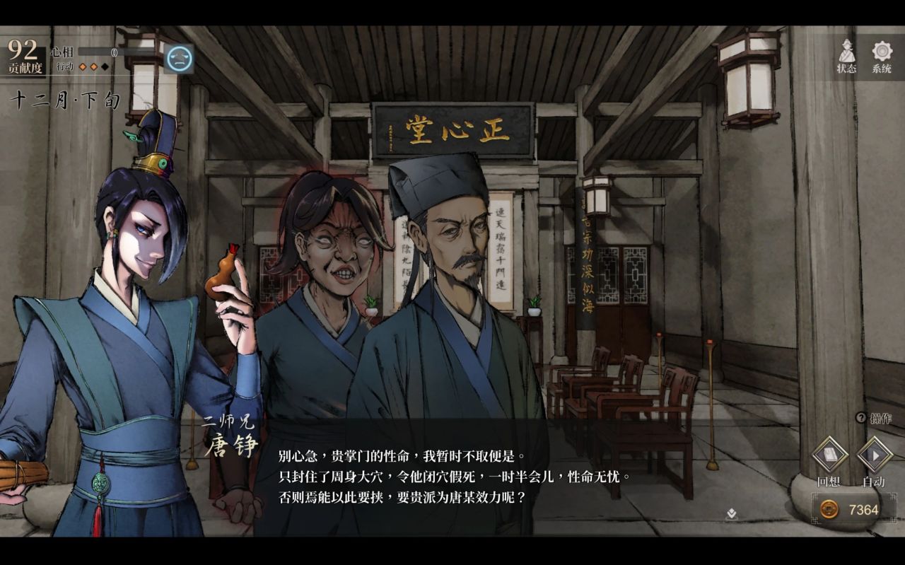 一周目,我走得是二师兄拜寿线,获得了尸心丹修复心脏的功效,这个重要信息。我自身有医术,在掌门生命垂危时,给他把脉也摸出了掌门大限将至。但二师兄给掌门喂药时,赵活依然相信了这套鬼话。这里不是故事前后逻辑没理顺清楚,就是二师兄的线可能没做完。