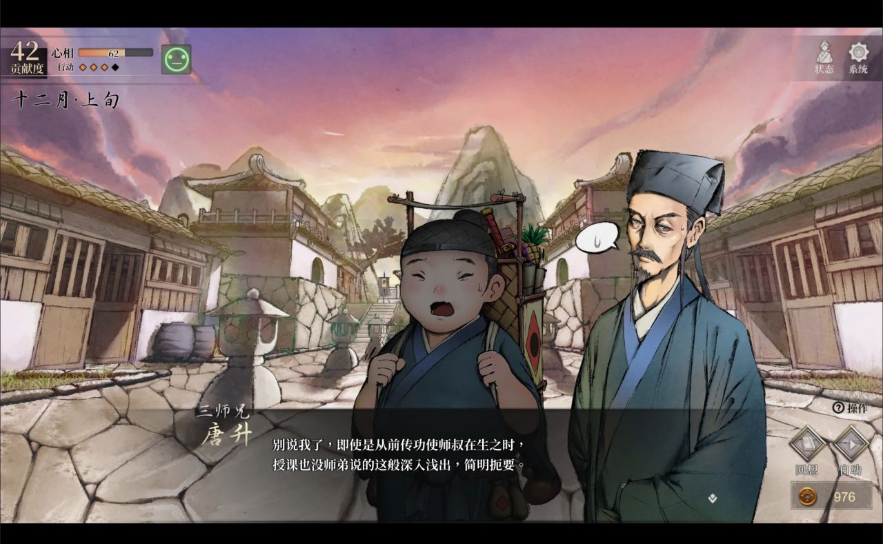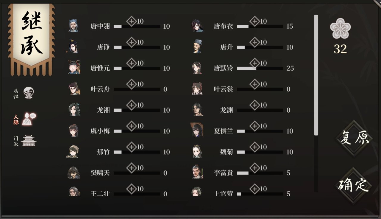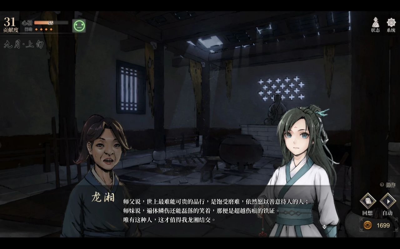 起码提升友好度部分,我觉得应该给玩家一些自由的“权限”,可以通过送礼提升一部分人的好感。就像《武林群侠传》根据自身厨艺,可以大幅度提高全谷人员的好感度,但《活侠传》全靠Roll点(当然,心相高好事件的概率相对高)……能否除了自己饮食外,也活用到一些道具呢?比如分给其它人一些食物,提升大家的好感与自身一部分心相?当然,这种系统实装后可能也会有问题。这里只是探讨一种可能性。