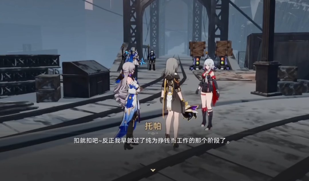 二次元手遊中的打工人通常都不是爲了賺錢才上班——許多角色並不缺錢。他們通常是爲了某種更大的追求。例如,《崩壞:星穹鐵道》中角色託帕的工作初衷是保障絕大多數人的利益。