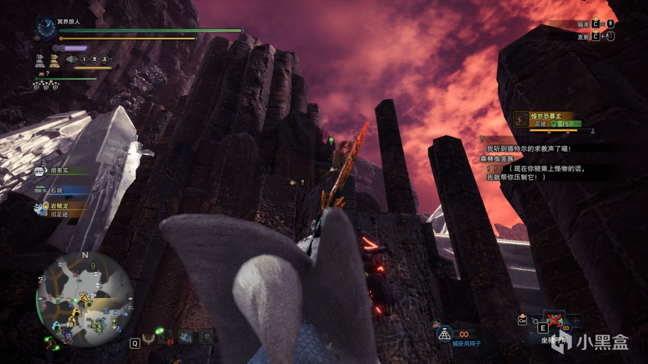 騎乘需要我們在空中的時候對怪物進行攻擊(操棍蟲表示這個我熟),一般常用方法是通過楔蟲讓自己人物飛起來對怪物進行空中攻擊,還有就是通過斜坡或者高臺進行空中攻擊,但是雙刀的斜坡搓背不加騎乘值。騎乘值滿了後人物就會到怪物的背上,這個時候就變成了人物耐力度值和怪物耐力值的對拼,人物耐力耗完就會自己跳下來然後大喘氣,怪物耐力耗完就會倒地。上背後地圖周圍會有一圈白光,這個就是怪物的耐力值,攻擊怪物就會消耗怪物耐力值,部分武器比如大錘和蟲棍上背後會有特殊攻擊方式。當怪物晃動的時候需要按住對應忍耐的按鈕(鍵鼠上側鍵,手柄RT鍵)來減少自身耐力消耗,當怪物拿身體撞牆的時候要按方向鍵移動來進行換位避免被撞下去。