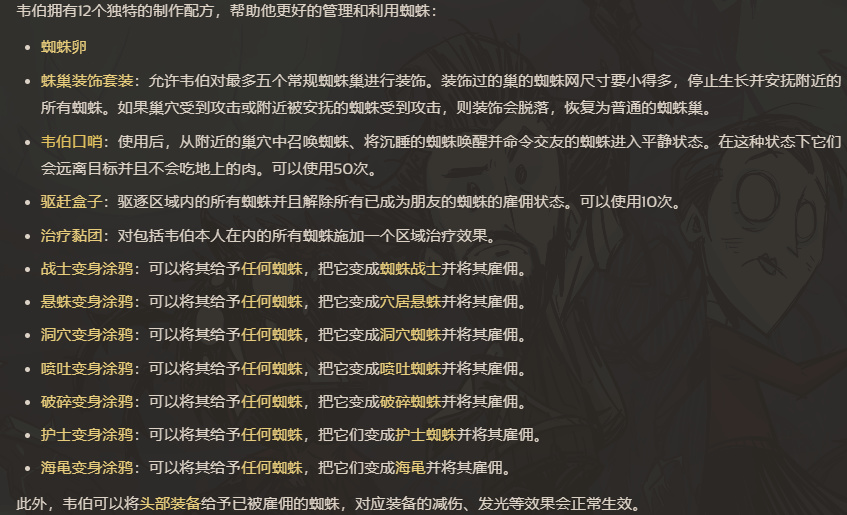 * 很好玩的一個角色,但是需要一定技術,因爲容易被豬哥仇恨,不會走位的萌新容易被豬哥單殺;在別的服務器玩之前最好問一下能不能選,不然選了直接就被踢了,因爲韋伯可以僱傭蜘蛛大軍,會導致服務器非常卡,影響每一個玩家遊戲體驗。