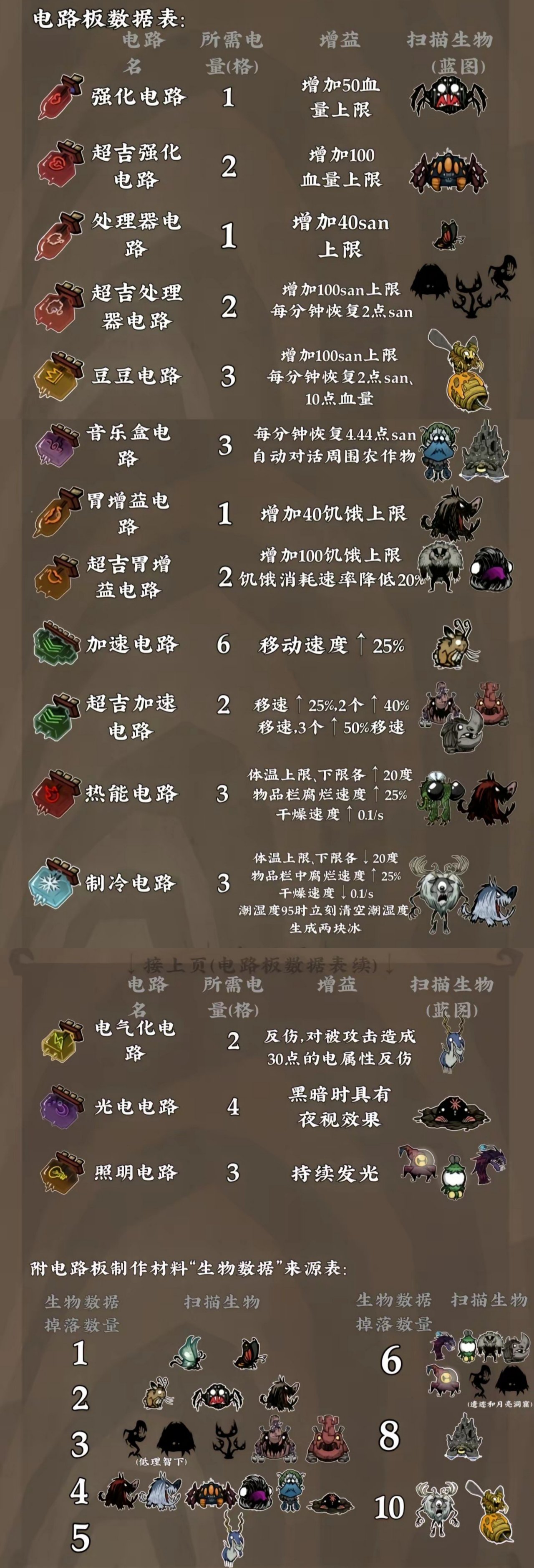 * 拾取掃描完畢的掃描儀,可以爲WX解鎖一樣電路板的製作配方。電路板會佔用一定量的電荷。每種電路板的插腳數目不同,有多少個插腳即佔用多少格電力值。當電力值滿足電路板的需要時,電路板提供的增益纔會生效。可以使用電路提取器來由高到低地取下電路板,損失電路板佔用的所有電力值,並消耗電路板 25% 的耐久。