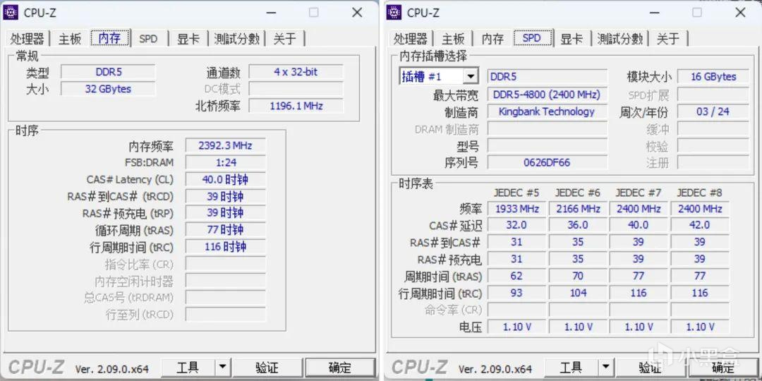 ▲同時,使用CPU-Z檢測下,可以看到內存確信也已成功安裝了兩條,預設時序爲40-39-39-77,24年03月份生產。