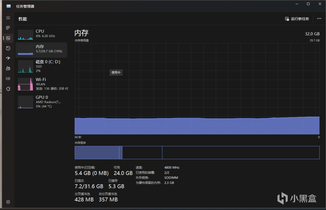 ▲進入任務管理器,可以看到兩條內存已成功安裝。且默認頻率爲4800MHz。