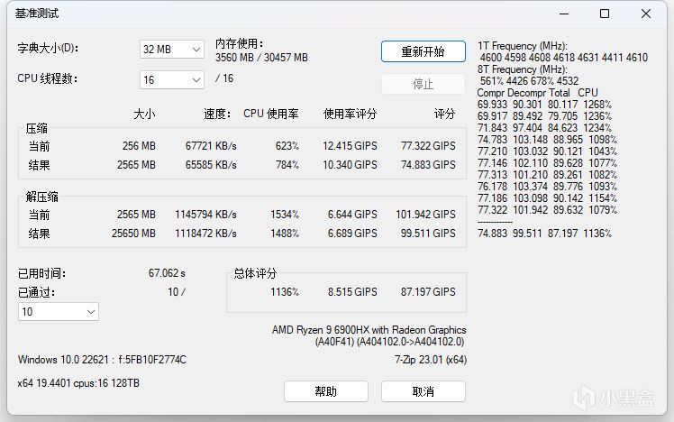 ▲7-ZIP壓縮、解壓縮測試,相對銘凡UM690S搭載的原廠內存,每項數據均有了很大提升。