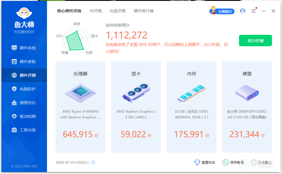 ▲再來看下整機的性能表現。銘凡UM690S在搭載了AMD銳龍9系6900HX處理器和金百達DDR5 4800MHz內存條後,整機在魯大師中的跑分超過了111萬,其中金百達DDR5 4800MHz的內存條單獨跑分達到了17萬。