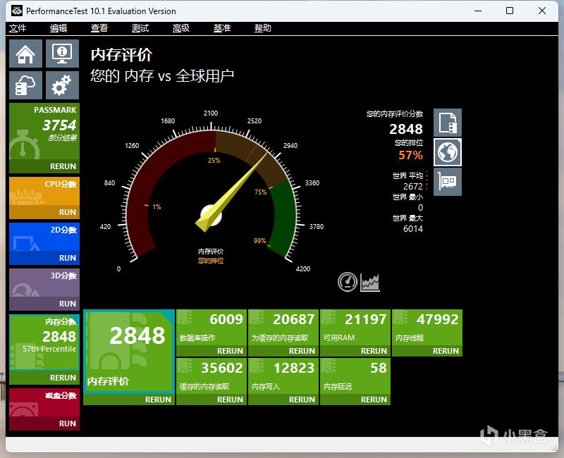 ▲使用PerformanceTest跑個分,從測試成果來看,內存的評價分數爲2848,全球排名57%。