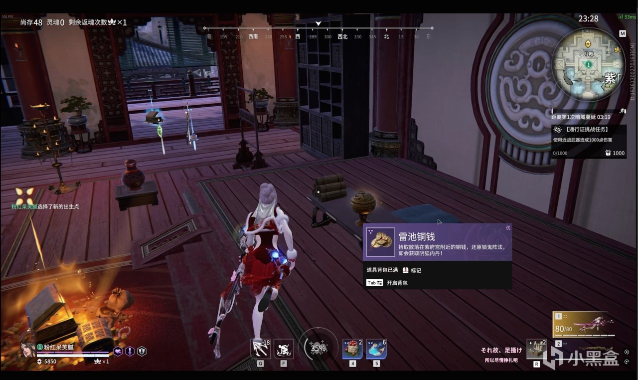 紫府宮解謎。把周圍屋子(左邊月下軒,右邊雲生榭,上面心月殿)都搜一遍:左右房子留意中間的桌子和牆邊的置物架;心月殿比較大,一樓桌子上、三樓桌子、置物架上和轉角的盆栽上;外面荷葉上。以上位置都有概率刷雷池銅錢,而且銅錢並不是一定有7個,錄視頻的這一把我搜了8個。