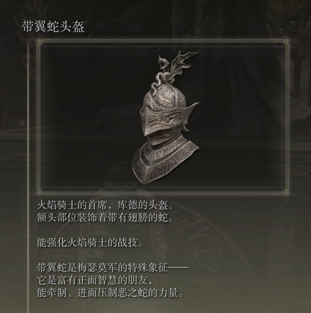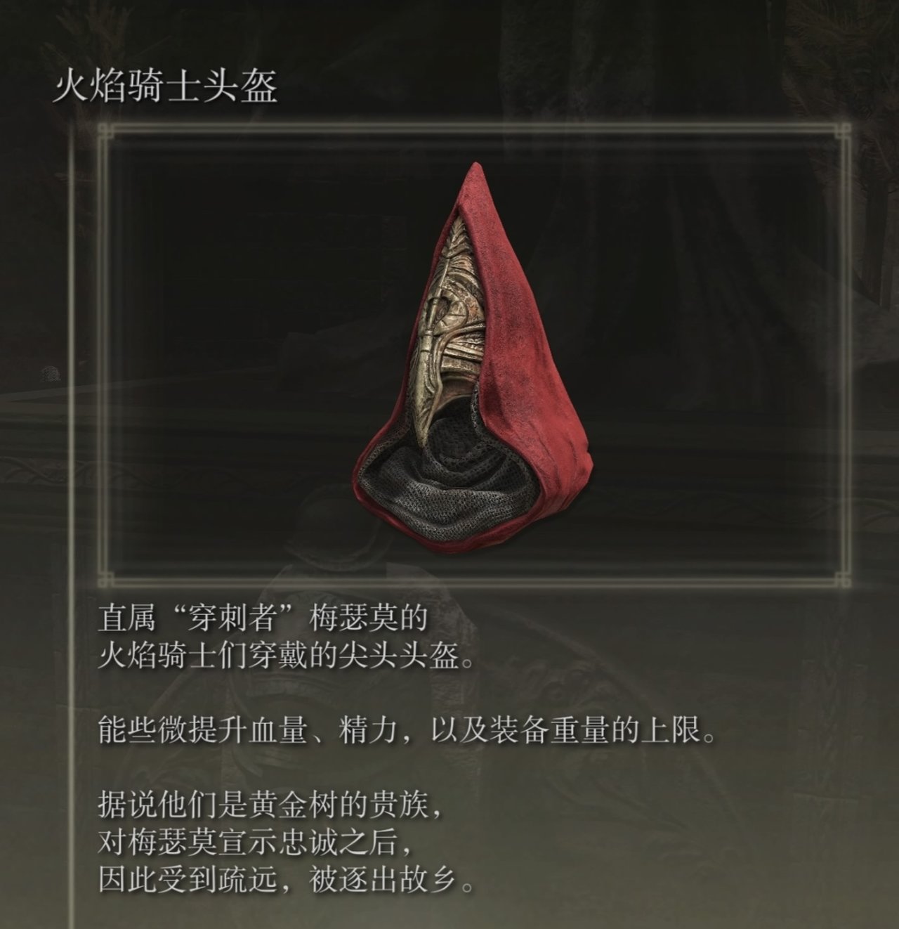 【火焰騎士頭盔】據說他們是黃金樹的貴物,對梅瑟莫表示忠誠之後,因此受到疏遠,被逐出故鄉。