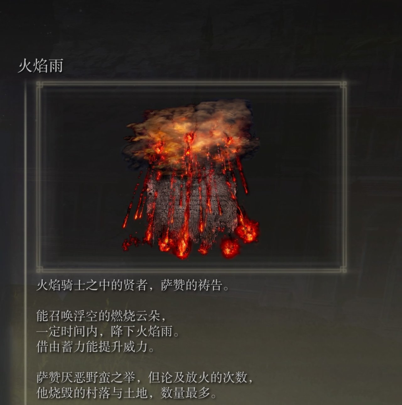 【火焰雨】火焰騎士中的賢者,薩讚的禱告,薩贊厭惡野蠻之舉,但是論放火的次數,燒燬的村莊和部落,數他的最多。