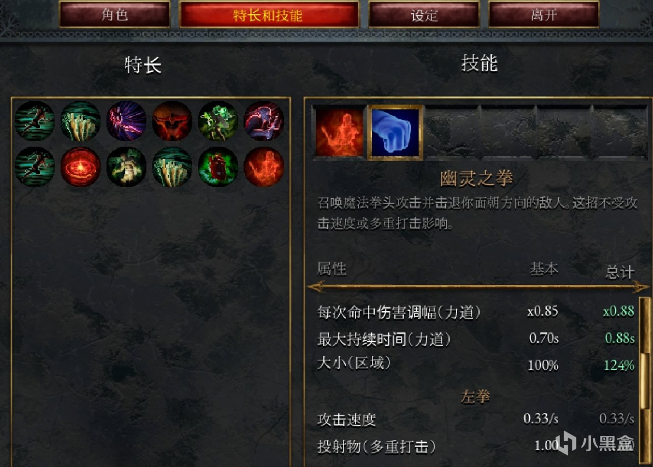 而另一方面,我们可以通过菜单栏的“特长和技能”来查看技能详情。举个例子,下图的“幽灵之拳”可以看到是能够吃到力道、区域的加成,不受攻速和多重打击的加成。