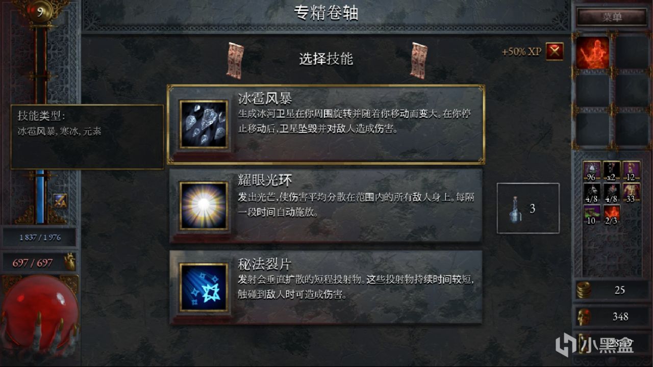 比如图中的“冰雹风暴”的技能类型是寒冰和元素,说明它可以吃到寒冰伤害和元素(魔法)加成。