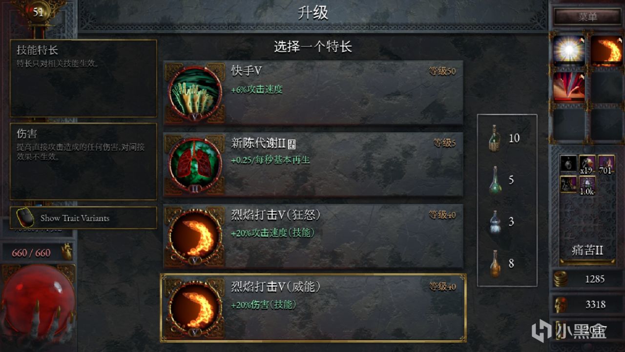需要注意的是,本作中的角色特长和技能特长都可能是多选且唯一项。简单来说,可能你15级解锁的升级选项,可能有三个不同的方向,大多数情况下只能选择其中1个分支。(后续可以通过药水固定的方式解决)。
