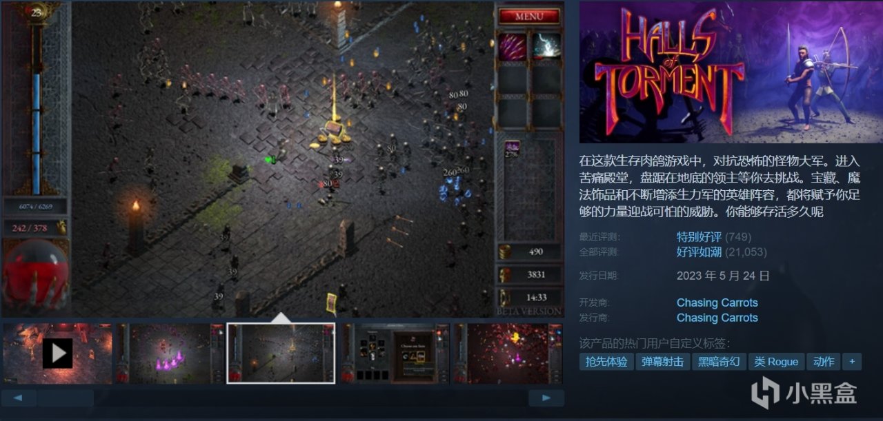 6月中旬,我在Steam上发现了这样一款好评如潮,好评2W+的类幸存者游戏——《苦痛殿堂 Halls of Torment》(本作在6月14号的大型更新中追加了简体中文支持)。